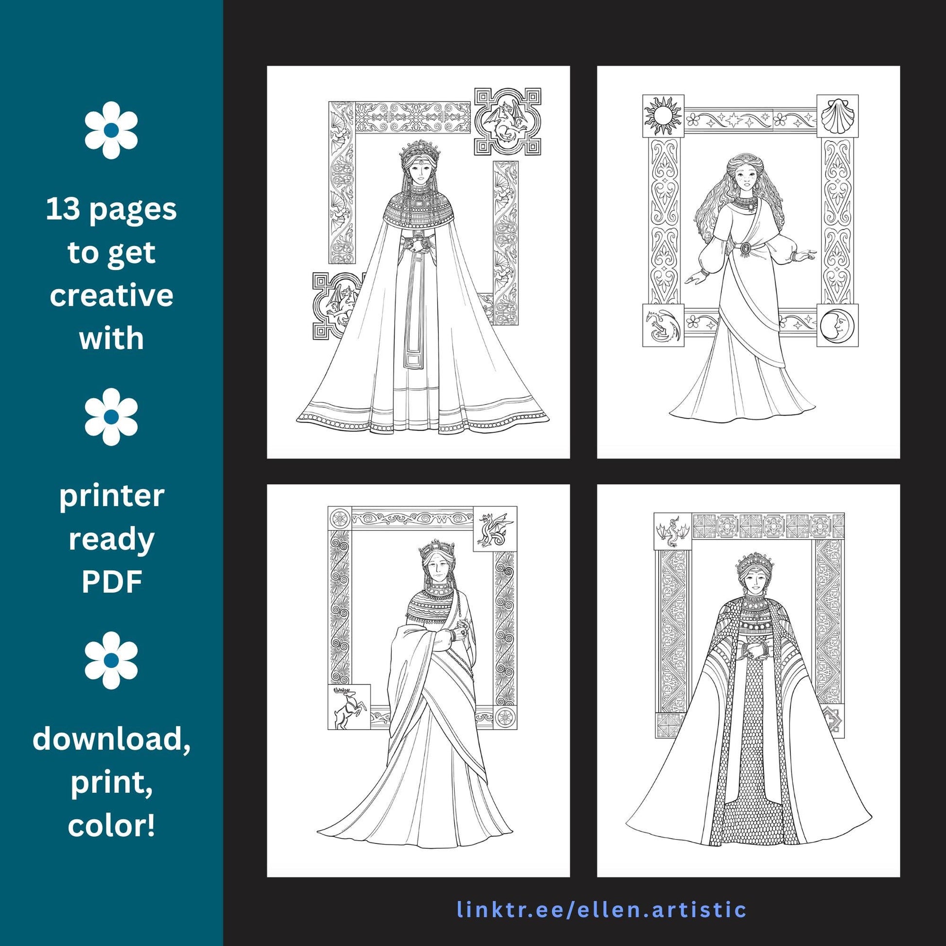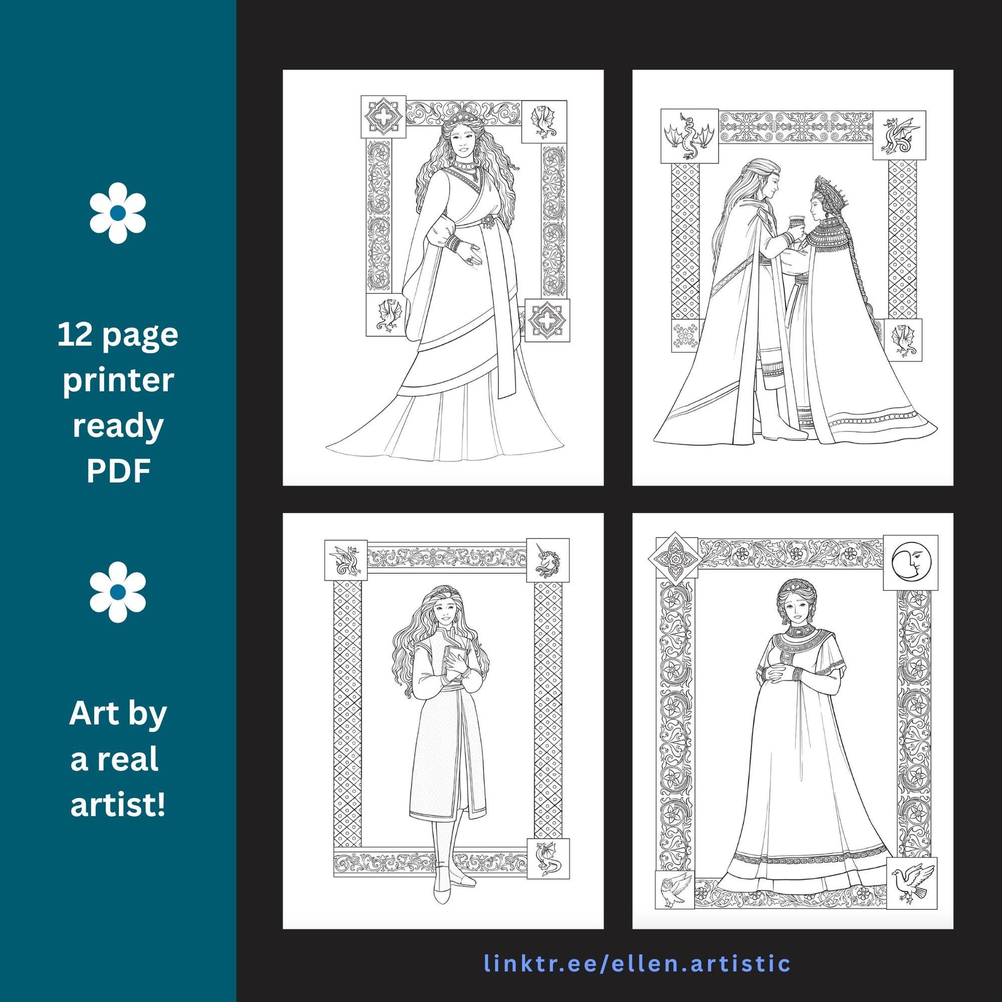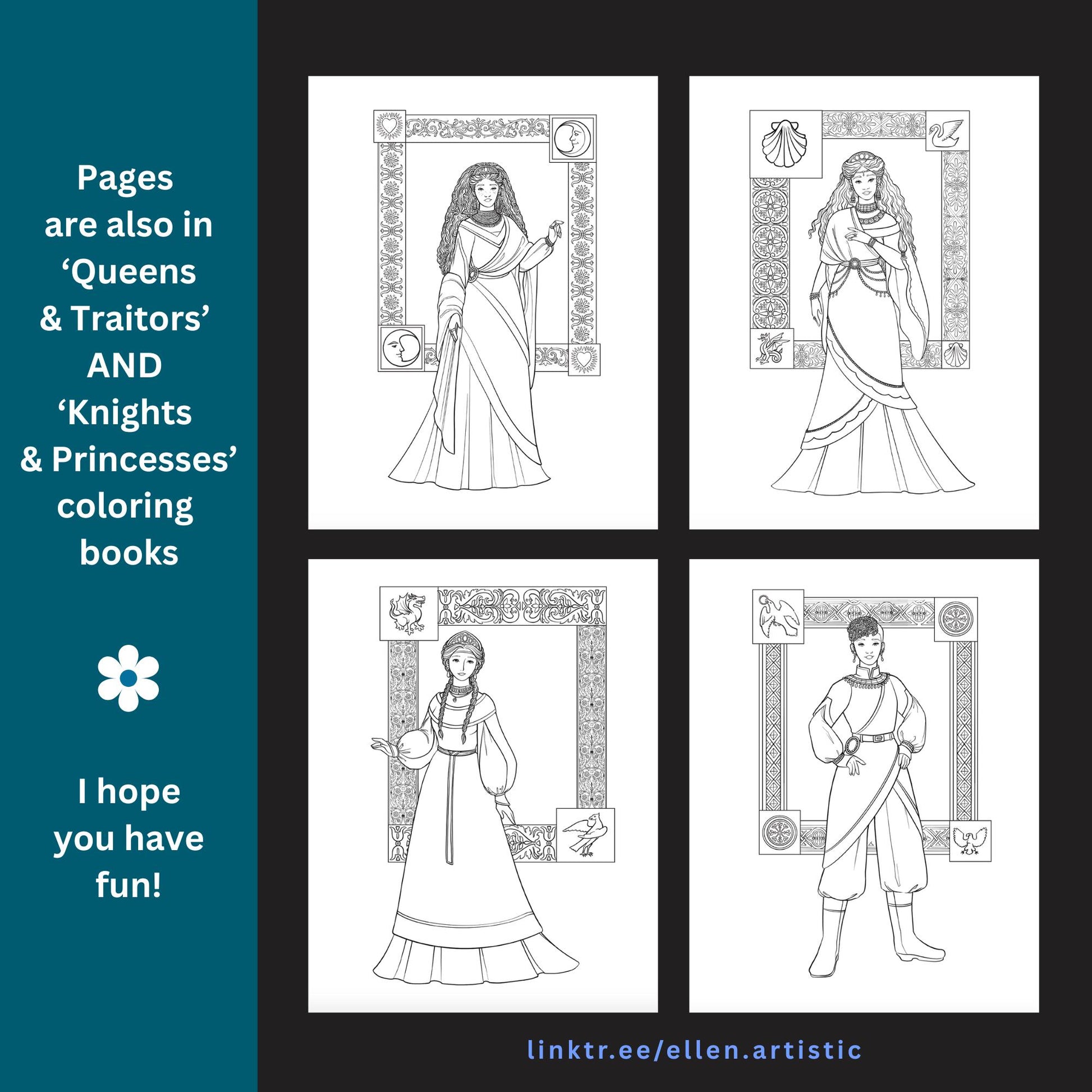 These illustrations can also be found in either the 'Queens & Traitors' or the 'Knights & Princesses' Coloring Books by Ellen Artistic. Be aware so as to avoid repeat purchases. (Note: Some of the bundles also have these repeats, however they all have the illustrations in the listing photos for cross-referencing.)
