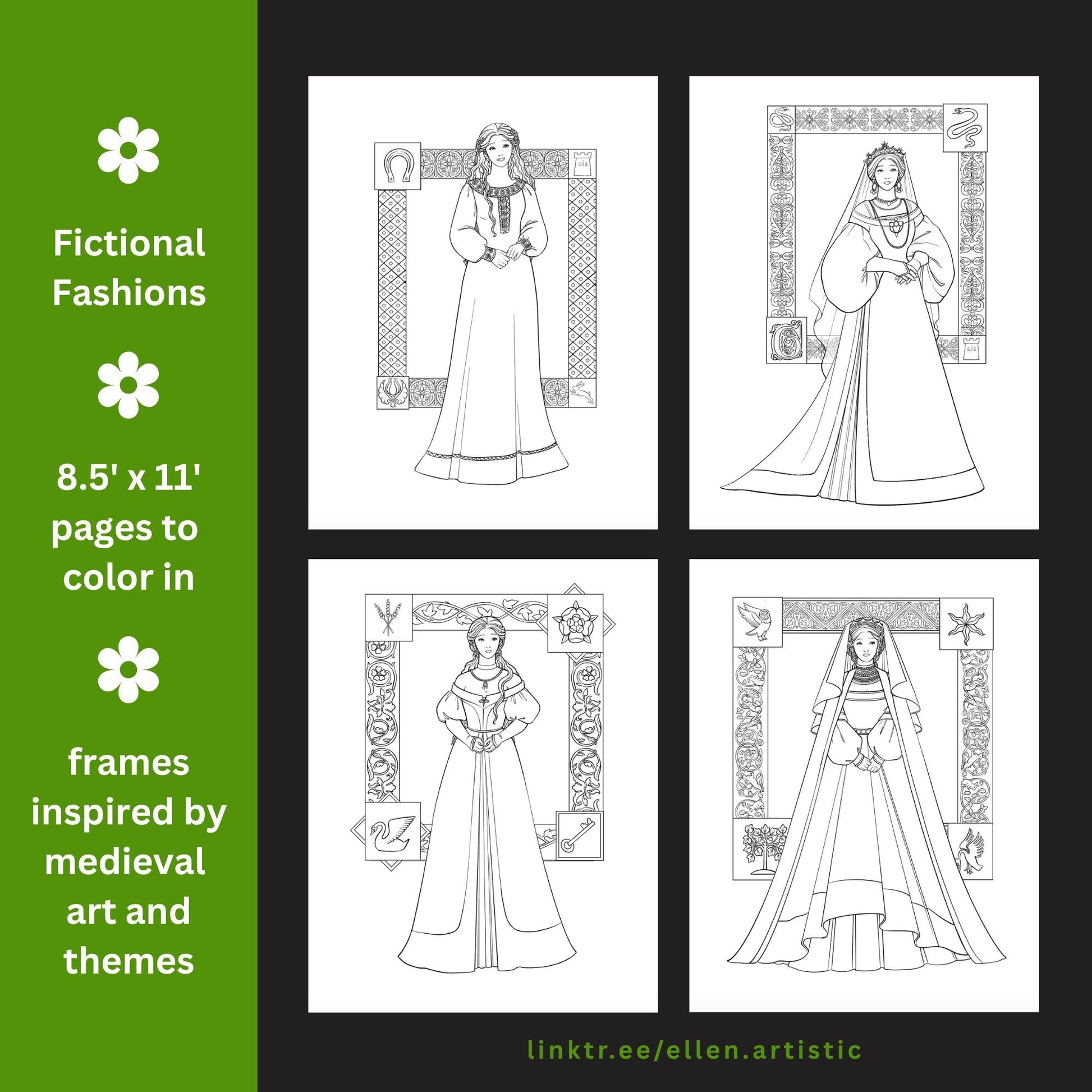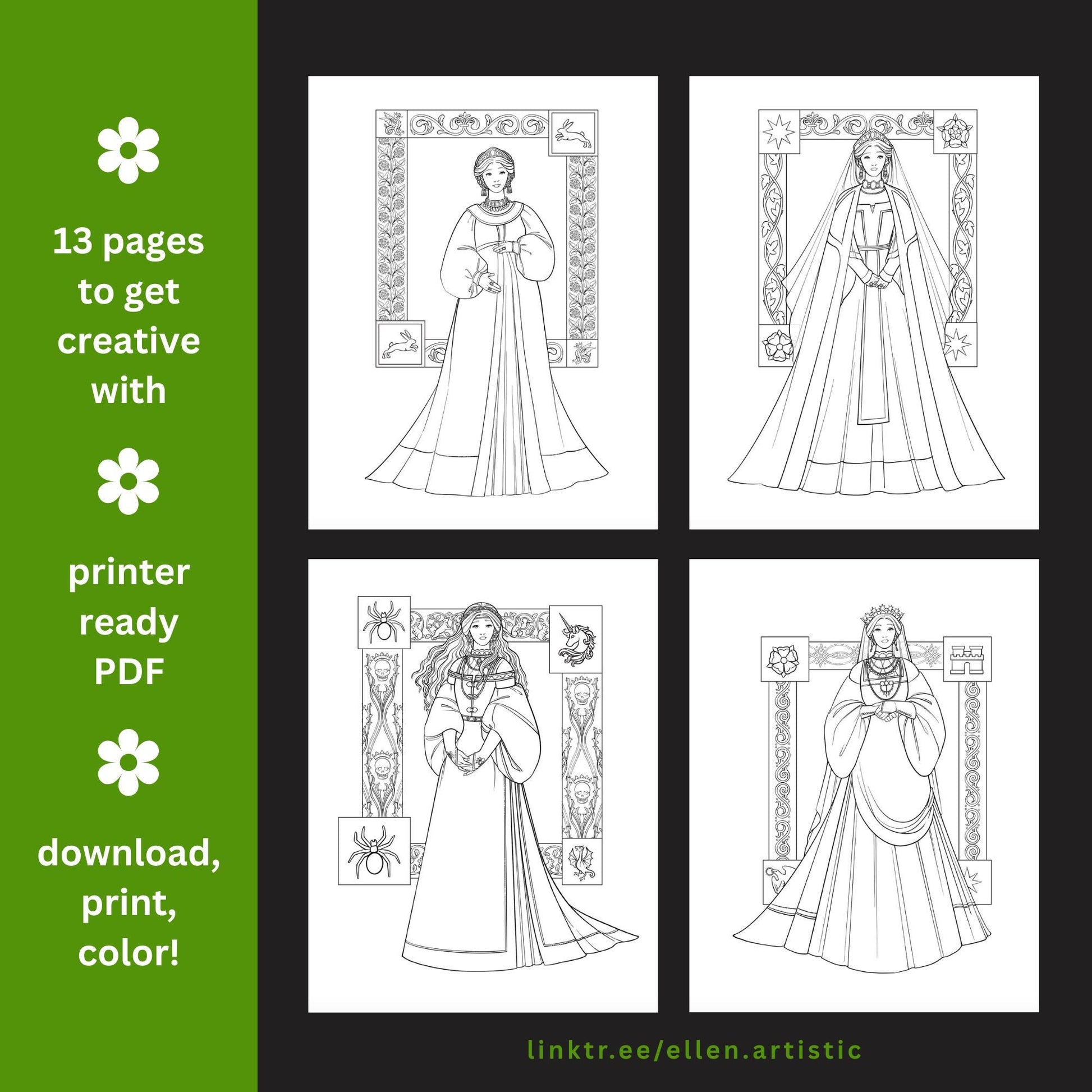 These illustrations can also be found in either the 'Queens & Traitors' or the 'Knights & Princesses' Coloring Books by Ellen Artistic. Be aware so as to avoid repeat purchases. (Note: Some of the bundles also have these repeats, however they all have the illustrations in the listing photos for cross-referencing.)