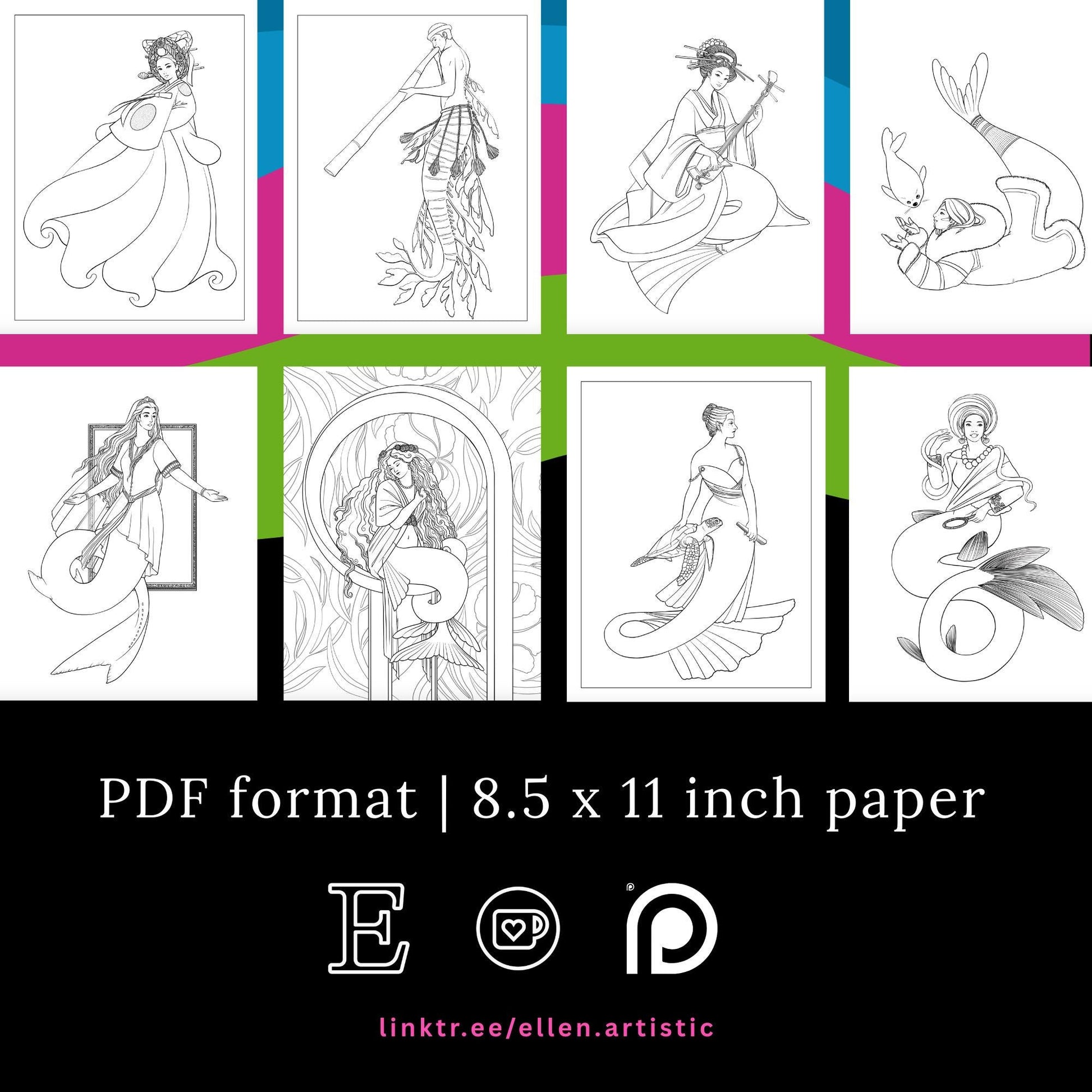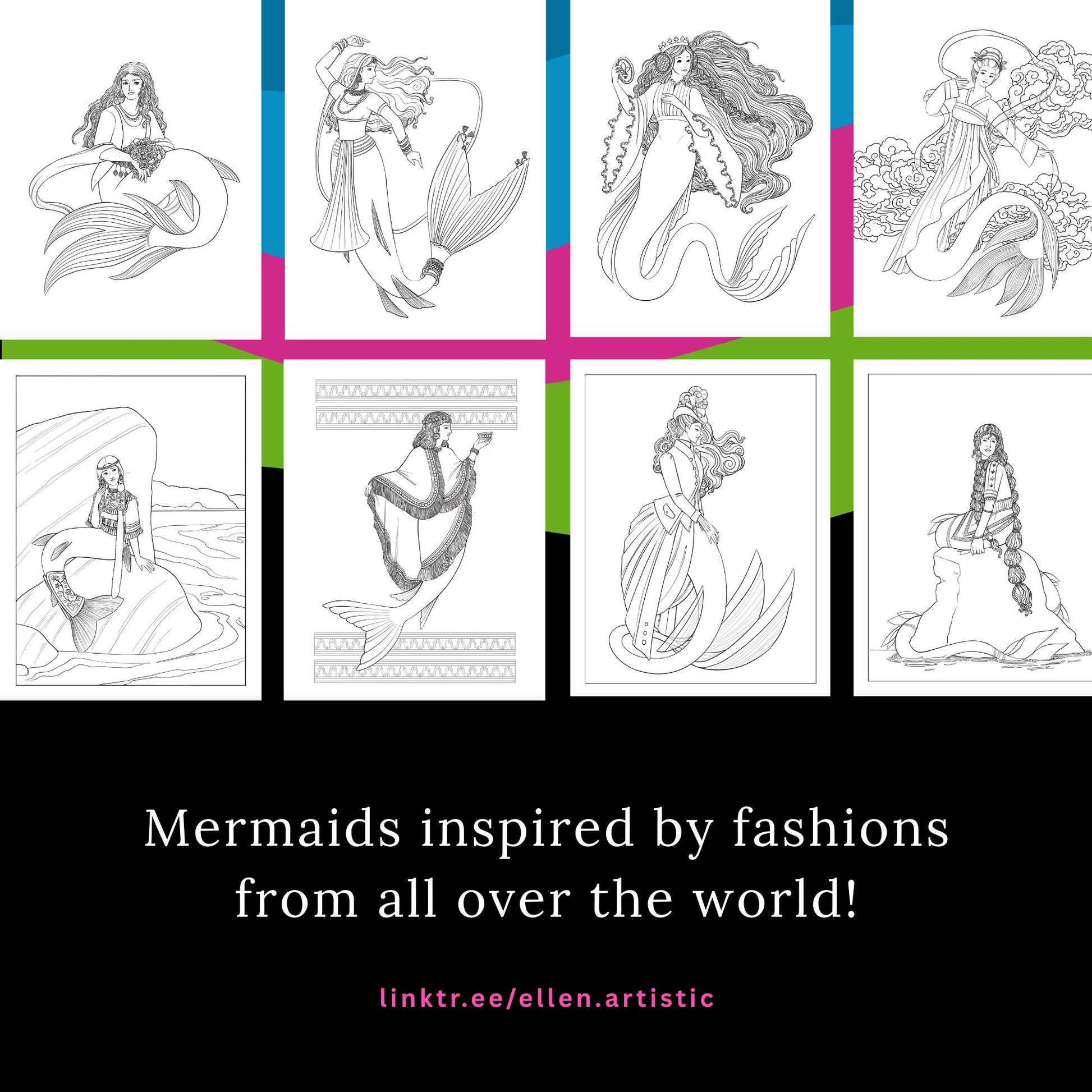 This coloring book is full of Historically Mermaids. There are over 50 different mermaid illustrations to color in, inspired by fashions from all over the world!