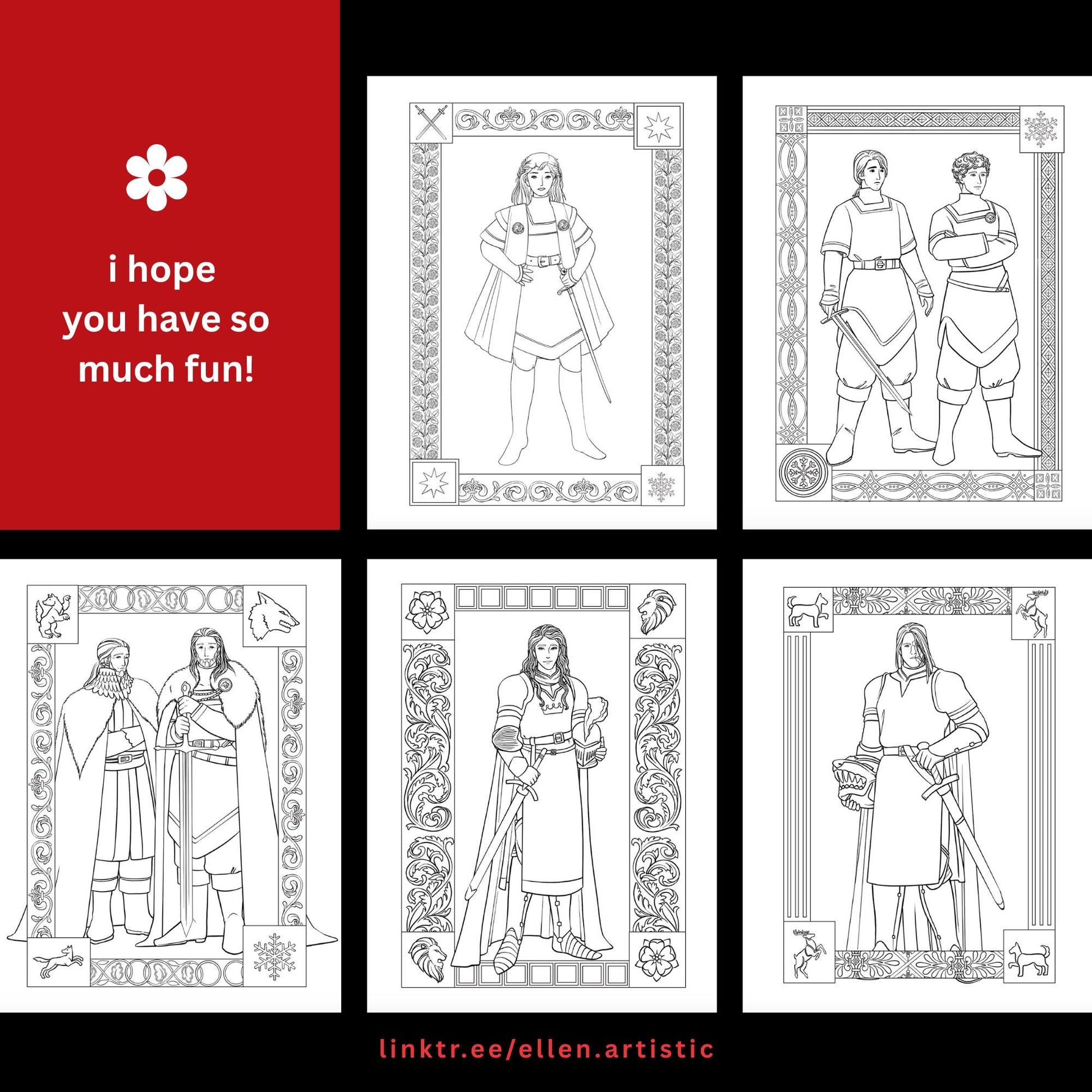 These illustrations can also be found in either the 'Queens & Traitors' or the 'Knights & Princesses' Coloring Books by Ellen Artistic. Be aware so as to avoid repeat purchases. (Note: Some of the bundles also have these repeats, however they all have the illustrations in the listing photos for cross-referencing.)