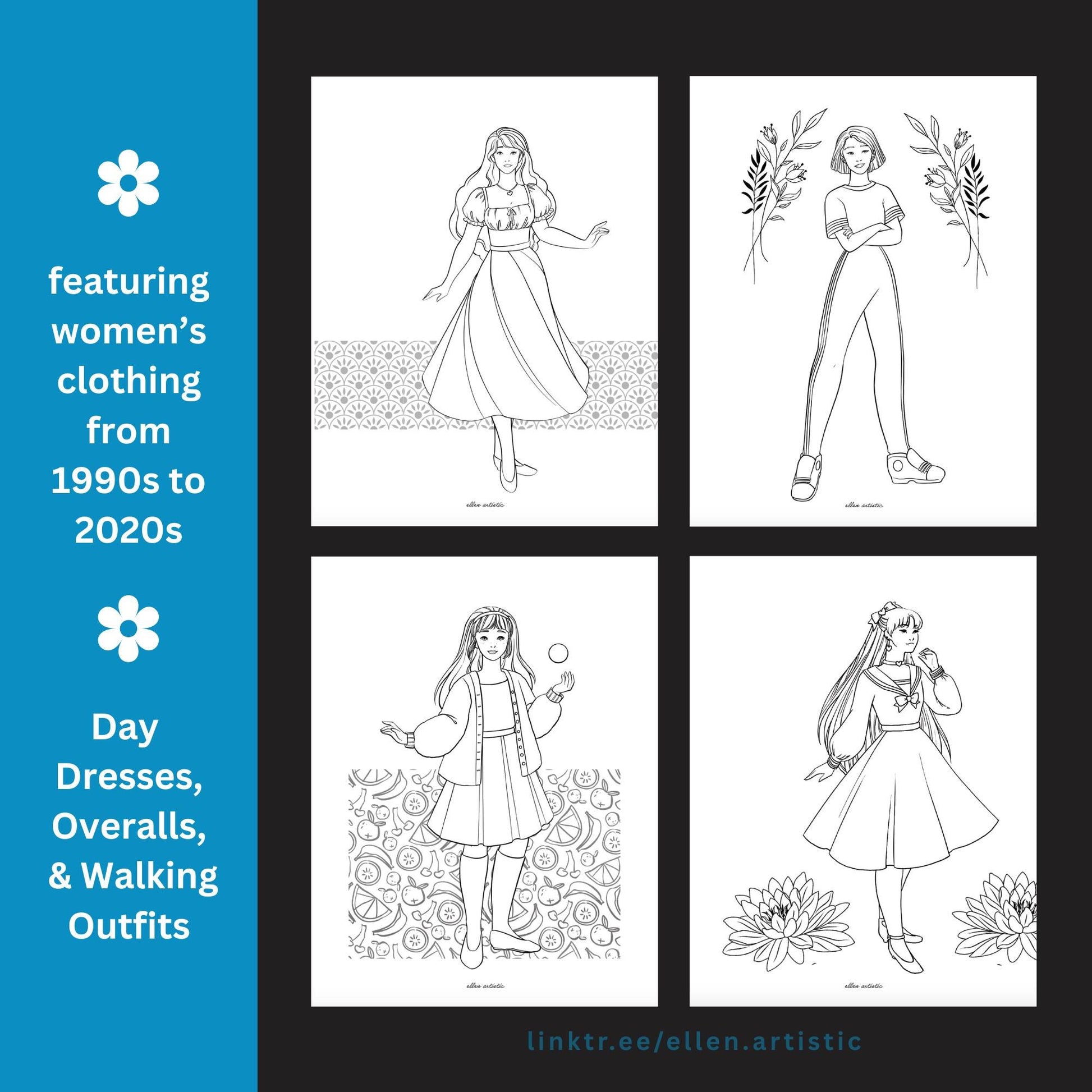 12 illustrations of modern women's fashion (approx 1990s to 2020s) with patterns, florals and frame to color in. Download the PDF, print and color to your heart's content. Pages are sized to 8.5 x 11 inches.